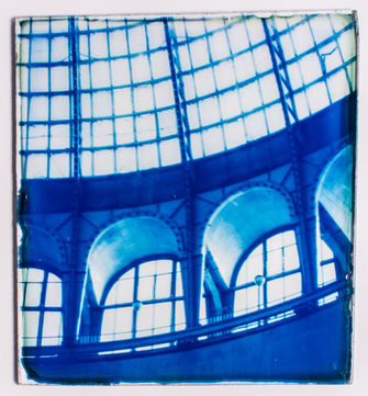 Cyanotype op papier, glas, textiel: Een blauwe afbeelding op witte ondergrond.